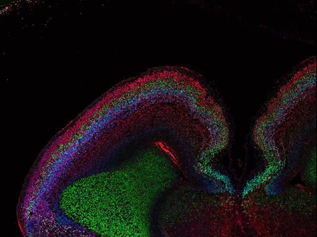 With as many as 10,000 specific types of neuron in the human brain, unpicking the complex orchestration of development remains a significant scientific challenge. Mouse models have revealed much about how the mammalian brain forms. Sliced vertically this fine film of tissue – from a developing mouse brain – has been stained to show various developing layers, identified by means of different genetic markers. Markers can provide different kinds of information about cells and organisms. A transcription factor [protein that helps switch on genes] called Ctip2 is here stained green. Ctip2 drives the formation of medium spiny neurons in the striatum. These neurons – key to motor ability – are damaged in Huntington’s disease. As scientists identify the processes underlying disease pathology, they pave the way for molecules with therapeutic promise to be tested. In this way, laboratory experiments feed into clinical practice offering the possibility of new treatments for neurodegenerative disease.
