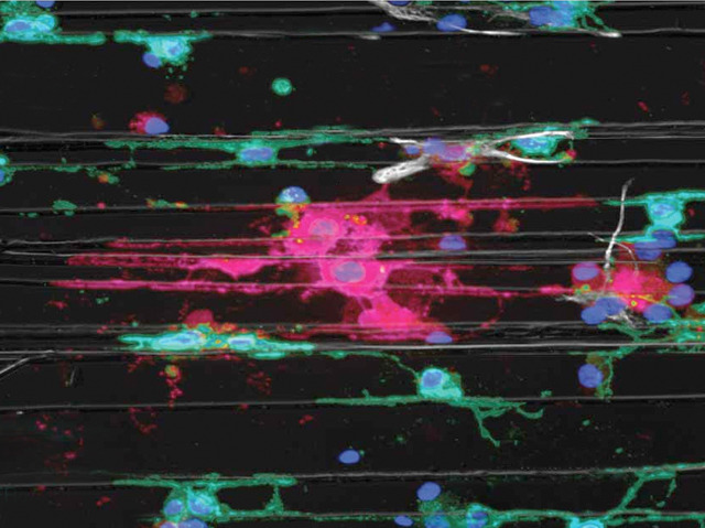 Man and machines are not that different. Our bodies are full of nerve cells that act as natural wires, conducting signals from one place to another. As a copper wire needs insulation to keep electricity flowing on the right course, so our nerves need a natural insulator called myelin. To help understand how this insulation wrapping occurs, scientists have created synthetic fibres (grey horizontal lines pictured) of just the right size to mimic nerves. When combined with a mix of cells of the nervous system, the myelin-producing cells (stained pink) respond to the fibres as though they are nerves, enveloping them in myelin. Holes in the myelin sheath can have serious consequences: nerve signals leak and are not transmitted efficiently causing symptoms such as tremors, blindness and speech problems. Learning how myelin wraps around nerves could help treat sufferers of demyelinating diseases such as multiple sclerosis.