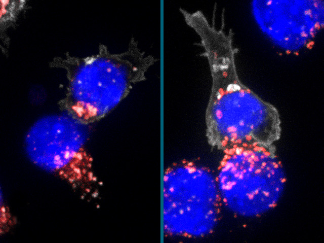 Constantly under surveillance for signs of trouble, diseased cells in our body get sent to their death at the hand of our immune system by T-cells. The T-cell pictured (left), with CD8 protein that distinguishes it highlighted in white, is locking on to its target cell (both nuclei stained blue) and injecting it with a cluster of toxic packages. These lytic granules (here labelled red) are precisely positioned inside the T-cell by the centrosome (where the cell’s skeletal elements are made). Attaching to the inside of the T-cell’s membrane the cell’s skeletal fibres pull granules towards it. Knocking-out a gene called Lck, stops the centrosome docking on the membrane (right-hand image) and lytic granules spill out into the fluid between cells. Mapping the labyrinth of molecular pathways that control centrosome docking provides scientists with more understanding of how cells of the immune system work in health and disease.