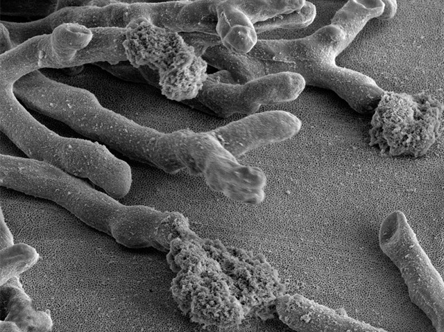 Whether you are breathing in the fresh air of the countryside or the smog of the city, odds are you have inhaled hundreds of spores of fungi. Aspergillus fumigatus is one such fungus. Its coral-like colonies thrive in compost heaps across the country and when inhaled it’s soon destroyed by our immune system. However for people with weakened immunity, such as those with AIDS or leukaemia, this fungus can be deadly. Anti-fungal drugs can be used to combat its destructive effects. Applying one of a family of anti-fungal agents, called echinocandins, results in irrevocable damage by causing the tips of the fungal branches to rupture (seen here highly magnified by electron microscopy). And because they target only the fungal cell wall – the tough outer covering – human cells are left unharmed.