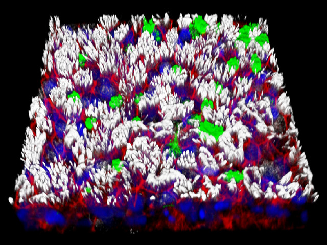 From the time we are born until adulthood, most of our cells are growing. Their replication, movement and repair are all part of a major construction job that makes us what we are. But growth is also a difficult balance – unnecessary growth in certain tissues can lead to cancer, while a lack of growth in ‘settled’ or differentiated tissues can leave holes that might have mended easily during early development. Originally taken from the lining of a human throat, these cells have been treated with chemicals which coaxed them out of retirement, to start growing again. After a few days, the cells were turned back into ‘throat cells’ (outlined here in red with their DNA stained blue), simulating transplantation in another human body. They quickly ‘remembered’ to develop mucus proteins (shown in green) and a carpet of microscopic hairs called cilia (in white) which sweep dirt from human lungs.