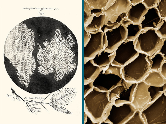 Robert Hooke (1635-1703) could have called them all sorts of things – capsules, pods, houses – instead he named the basic building blocks of life 'cells'. Looking down a microscope at a slice of cork (Quercus suber, left), he thought its honeycomb pattern resembled rooms in a monastery – rows and rows of tiny monks’ cells. With modern microscopes, not only can we see the shape and texture of similar cells in greater detail (pictured on the right) but it’s also possible to delve deeper; to follow what goes on inside. Far from being simply 'filled with juices' as Hooke described in 1665, we now know that both plant and animal cells are full of life: capable of growing, repairing, adapting and communicating – not unlike the hustle and bustle inside a 17th century monastery, really.