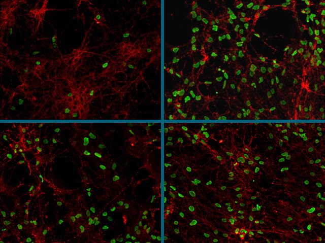 Alzheimer’s disease is the most common cause of dementia in adults. It happens when brain cells start producing damaging molecules that destroy them, and its progress is unstoppable. Researchers are testing an experimental 'personalised' treatment produced from the liquid part of a patient's own blood, known as plasma. They think this plasma, which contains lots of nutrients, could encourage brain cells to resist the damage and survive. The effects are seen in this picture, which shows untreated brain cells (top left), compared with cells dosed with plasma from young or old people and an Alzheimer’s patient (top right, bottom left and bottom right, respectively), which all increase the number of brain cells (stained green). The team have seen promising results from tests of the plasma, delivered as a nose spray, in mice with a form of Alzheimer’s and are hopeful it could become a treatment for patients one day.