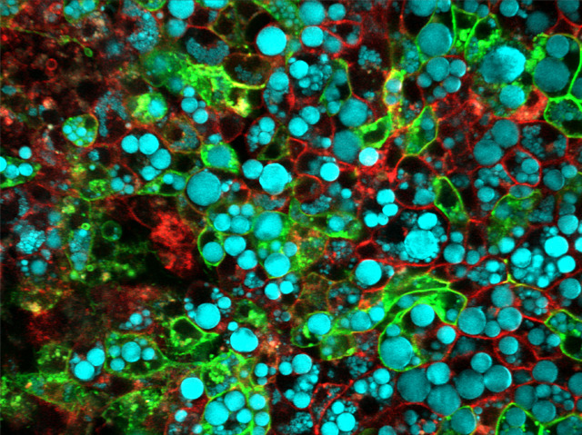 Not all fat is equal. The lipid cells that sit around our organs (pictured) are much more dangerous than those that pad our body from just underneath the skin. What’s more, it now appears that the different fats are created unequal right from the start. Using genetic modification, scientists changed a specific group of mouse embryo cells in such a way that all their descendants light up green. When they checked full-grown mice, lots of green cells carrying lipid droplets (blue) showed up in the ‘bad’ fats, but none were found in the ‘good’ fat underneath the skin. This shows that the two fats have different developmental roots, and thereby solves a long-standing mystery in obesity research. If scientists can find a way to stop these ‘green’ cells making more of themselves, they might be able to stop the body laying down bad fat.
