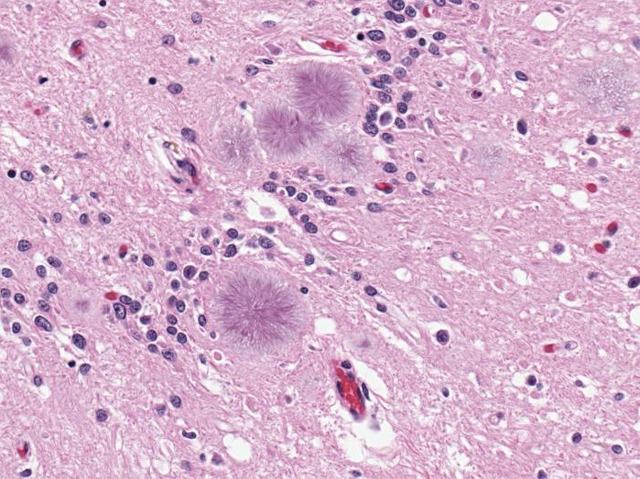 Variant Creutzfeldt-Jakob disease (vCJD) is a rare and invariably fatal brain-wasting condition. It’s the human form of bovine spongiform encephalopathy (BSE), commonly known as 'mad-cow disease'. At the root of both diseases are prion proteins – misfolded proteins that coax other proteins to misfold as well. This self-amplifying process results in an accumulation of toxic protein clumps (the large, fibrous blobs seen here) that destroy neurons. A BSE outbreak in the 1980s led to a surge of vCJD cases in the UK, and a recent study found that 1 in every 2,000 people there carries the disease-causing prion protein. But that doesn’t necessarily mean they will develop vCJD, because prion proteins were only found in the lymphoid system – including the spleen and tonsils – which is more easily infected than the brain. Nevertheless, scientists will be watching closely as it’s still not clear if the infection can spread from the lymphoid system.