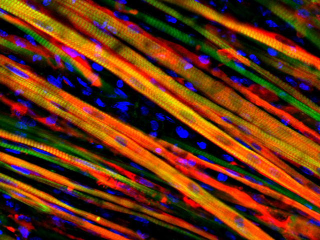 For the first time biomedical engineers have grown living skeletal muscle in the lab that can contract as strongly as normal muscle, and can repair itself inside a living animal. The researchers implanted this lab-grown muscle into a live mouse and watched it grow through a window on the mouse’s back. Here, peeking through this portal, the many strands of muscle fibre stained different colours and viewed through a microscope can be seen. To put the muscle to the test, it was stimulated with electric pulses and the strength of each contraction was measured. It was more than 10 times stronger than any previously engineered muscle. Lab-grown muscle is now being investigated for its ability to repair diseased and injured muscles.
