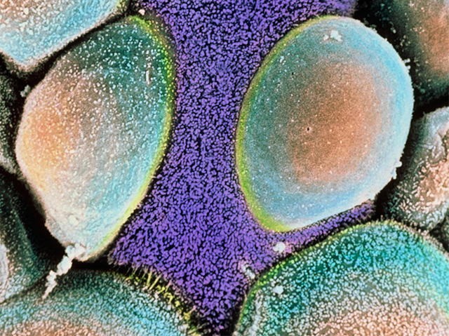 Ovarian cancer often goes undetected until it has spread to other parts of the body and becomes difficult to treat with surgery and chemotherapy. This is largely because there’s no national screening programme to diagnose the disease at its earliest stage when it is most curable. But, a new non-invasive method tested in the UK Collaborative Trial of Ovarian Cancer Screening (UKCTOCS) can detect almost twice as many incidents of cancer as conventional strategies. The new technique takes measurements of a biomarker – a specific protein released by ovarian cancer cells (blue and pink cells shown) – from a series of blood samples and interprets its change over time to more accurately predict a woman’s risk of developing ovarian cancer. However, the more important question of whether the cancers detected were caught early enough to save lives will depend on the final analysis of the trial, due out later this year.