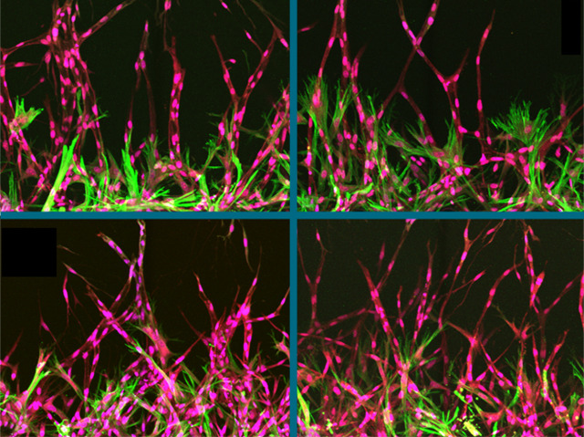 Blood vessels – the tubes that make up our biological 'plumbing' – are essential for carrying oxygen and nutrients around the body, forming their delicate network as we grow in the womb. But in some illnesses, such as cancer or the eye disease diabetic retinopathy, new vessels sprout where they aren't wanted, fuelling tumour growth or causing sight problems. In order to create new blood vessels, two types of cells have to get together and co-operate: endothelial cells and pericytes. To find out more about this process, scientists are cultivating these cells in the lab, using special conditions to engineer the growth of tiny blood vessels, like the ones seen here. Not only is this providing a useful model to figure out how vessels grow in normal development as well as disease, but they're a handy tool for testing drugs that might alter the process, potentially leading to new treatments.