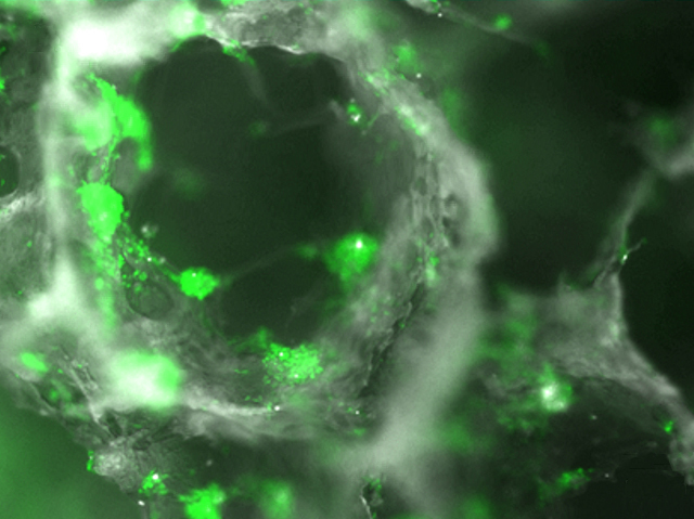 Working out how our complex brains first developed is a real head-scratcher. Here researchers used a biological model – a simplified version of early processes in the brain that can be studied in the lab as they happen. They first prepared microscopic scaffolding out of silk (shown in white) that has a porous structure similar to the brain's white matter. Flooded with a supportive material called collagen, the silky scaffold provides a microenvironment for neurons (artificially stained green) to grow, cluster and connect together, much as they do in the nooks and crannies of the developing brain. This example of tissue engineering allows early developmental decisions to be watched, timed and compared: scientific measurements that are otherwise impossible or unethical to make in embryonic brains.