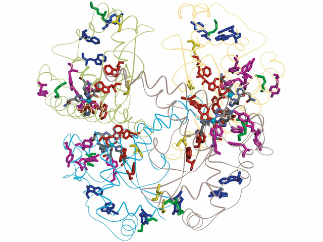 Earth’s atmosphere changes over time – the amount of oxygen has built up from virtually zero over billions of years. Living organisms have had to adapt to this changing atmosphere, developing mechanisms to cope with the presence of oxygen and the dangerous by-products of respiration known as reactive oxygen species (ROS), which can damage our cells. Proteins and enzymes are particularly susceptible to this oxidative damage, which can lead to many conditions including Alzheimer's, cancer and heart failure. Studying the protein structural database has revealed that many protein structures contain the amino acids tyrosine and tryptophan. Researchers believe that these amino acids are being used to transport ROS away from the vulnerable sites of proteins. Pictured is SOD2, an antioxidant enzyme involved with respiration. The red, pink and blue chains represent different tyrosines and tryptophans. This finding gives insight into how cells adapt to protect against unwanted oxygen species.