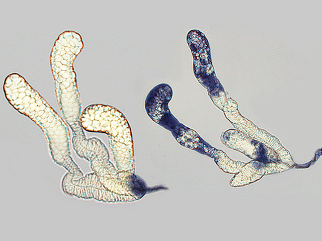 From slobbering dogs to drooling babies, we’re all familiar with the sight of saliva. What your eyes may miss is the saliva that comes from a mosquito bite, which can bring with it the malaria parasite Plasmodium. Plasmodium sits in the salivary glands of an infected mosquito waiting for a chance to spread to its next victim. Researchers therefore investigated whether damaging the salivary glands of mosquitoes impacts Plasmodium infection. Mosquitoes were genetically engineered to produce very little saliva. The salivary glands of these mutant mosquitoes (right) underwent more cell death (blue) than those of normal mosquitoes (left). After the mosquitoes fed on infected blood, the team looked for Plasmodium parasites in their salivary glands. Normal mosquitoes contained many parasites, while mutants hardly any. Consequently mutants were unable to transmit the parasite onto another host. Mosquito salivary glands could therefore be an ideal target for controlling the spread of malaria.