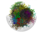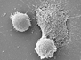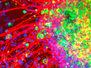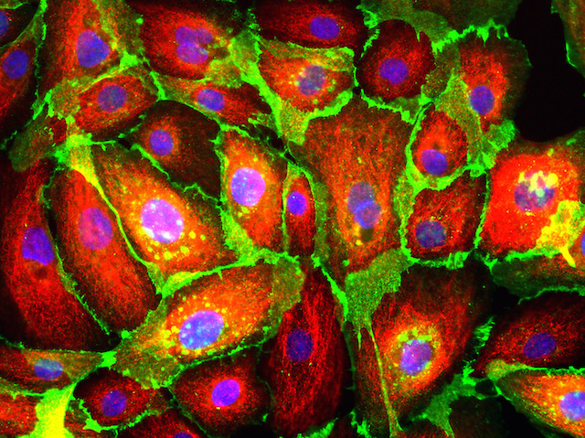 These colourful cells are human mammary epithelial cells. They’re normally found lining the network of tree-like milk ducts inside female breasts, but here they’ve been grown in a plastic dish. Because they grow so well in the lab, mammary epithelial cells are a useful way of studying many aspects of breast cell growth and behaviour, especially the development of breast cancer – one of the most common types of cancer in the world. Not only can scientists tweak the genes and molecules within the cells to see how they respond, revealing key drivers behind the process of tumour growth, but they can also use them to test potential new drugs to treat the disease. One area of research focuses on certain molecules involved in sticking cells together, stained here with red and green dyes. These interactions are faulty in tumours, so understanding and targeting them could lead to important future therapies.