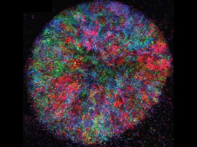 This bustling yeast colony is the ultimate example of giving back to the community. Artificial fluorescent proteins act like beacons showing which yeast cells are producing histidine (blue), leucine (green) and methionine (red). These are metabolites, chemical food that yeast often produce for themselves but also, as researchers found, offer to their neighbours. Over generations yeast randomly lose the ability to produce different metabolites (due to genetic changes) – this colony has become a bit like a busy market as yeast cells trade different metabolites to survive. Only a lucky few are producing their own red, green and blue-coloured metabolites (their overlapping colours appear as white dots). The rest must swap or die, such as the purple (red with blue) yeast cells clamouring around green leucine-producers. Researchers believe this is proof of cooperation inside sprawling colonies, another example of the resilience of yeast that often produce stubborn infections in humans.