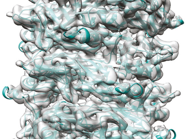 Around 50% of women will experience a painful urinary tract infection (UTI) during their lifetime. UTIs arise when bacteria travel through the urethra to the bladder, where they can multiply. The most common cause is the bacterium Escherichia coli, which normally lives in our digestive canal. It latches itself onto the tract’s lining using miniature, tightly coiled ‘tentacles’ called pili, strong enough to defy the force of urine flow, and enabling E. coli to linger and cause infection. Pictured is an experimental model of a pilus (with its atomic structure shown in green), which is helping researchers to understand more about the molecular interactions that take place between pili and urinary tract, and how E. coli can survive the harsh force that a stream of urine creates. With this closer look comes the chance to discover new ways of tackling and preventing UTIs.