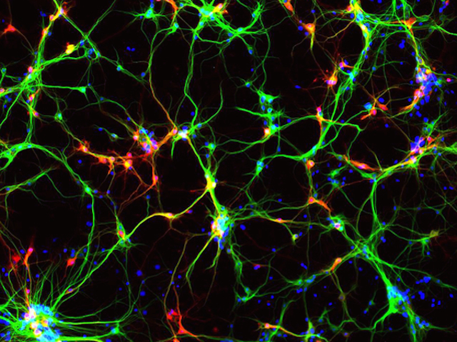 Human coronaviruses (HCoVs) are involved in many human respiratory diseases, including the common cold. They can also invade neurons [nerve cells] so it’s thought that they may be involved in some neurological diseases. The image shows neurons with their nuclei in blue. The red ones have been infected by HCoV, whereas the green ones haven’t. Scientists studying them recently found a mutation in HCoVs taken from patients that wasn’t in the laboratory version. This mutation leads to a change in the spike protein, which means that it can be cut up by the cells it invades. This makes the mutated viruses less deadly and slower to spread through the nervous system, though they are still just as capable of invading neurons. They also kill fewer victims, so they could be more likely to create long-term infections of the nervous system as the hosts survive.