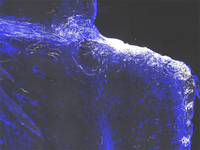 This magnified area of a mouse’s brain shows a severe injury. Scar tissue (highlighted in blue) surrounds the crushed optic nerve; the mouse is blind. Yet something remarkable is happening – nerve fibres are regenerating (shown in white) after researchers manipulated genes responsible for their growth. Job done – one might think – this mouse will see again! But laying new fibres is only half the story. These new fibres have no myelin, the waxy insulation needed to transmit signals from the eyes to the brain. Instead, the team injected the mouse with a drug called 4-AP, known to boost signals down poorly myelinated nerve fibres. Inspired by restoring the mouse’s sight, the team are working on a combination drug treatment that repeats this 'healing' process, and may one day be used to treat human nerve damage in conditions like glaucoma.