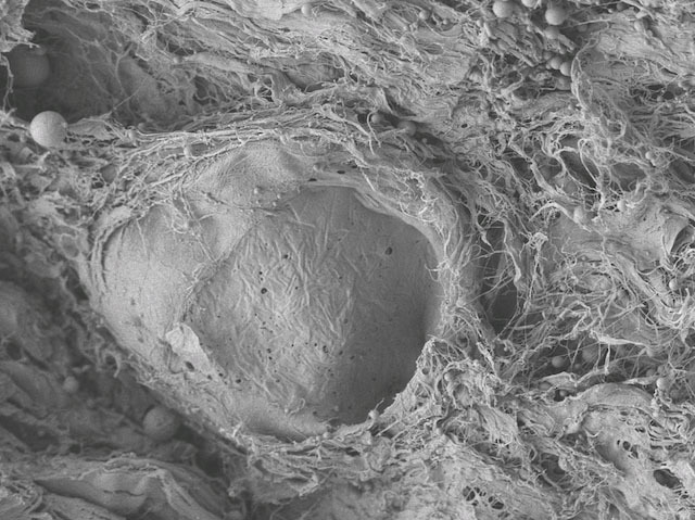 When someone gets an organ transplant, there’s a risk that their immune system will attack it, as it doesn’t have the same cellular markers as the rest of their body. Lately we’ve been able to reduce this risk for certain organs by decellularising them – stripping the cells away to leave the supportive structural mesh called the extracellular matrix (ECM) – and growing the patient’s own cells on them. Scientists recently examined how decellularisation affects the ECM in different tissues, using samples from pigs. They found that up close there were small structural changes in the ECMs. Additionally, muscular tissues could take more stress after decellularisation, but skin became weaker. The image shows decellularised skin: the hole used to contain a hair follicle, but these cells have been extracted: removing cells like this partly contributed to weakening the skin. This research helps us develop better ways to treat transplant tissue.