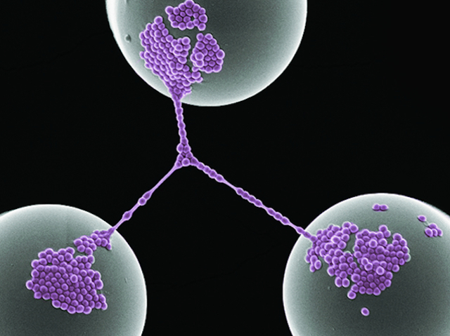 Stretching between ‘microposts’ much smaller than the width of a human hair, Staphylococcus auerus bacteria form a network of strings that look like the work of Spider-Man. Each purple dot is an individual bacterium while the large grey circles are the tops of the poly-dimethyl-siloxane microposts. By creating such supports of different shapes and textures, scientists are gaining a better understanding of how bacteria attach to surfaces. Bacterial colonies form these kinds of networks as they grow, for example on surgical implants, cooking implements and human tissues, to create a barrier against immune cells, drugs or chemicals seeking to kill them. Understanding how bacteria adhere will bring scientists a step closer to designing surgical implants that are difficult for bugs to cling to, and maybe even drugs that can stop their attachment, thereby reducing the risk of infection.