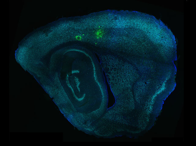 Toxoplasmosis, caused by the parasite Toxoplasma gondii, is a disease that affects the brain and occurs in humans mainly as a result of eating parasite-infected meat or from contact with infected cats’ faeces. It doesn’t usually cause symptoms in healthy adults but for people with a weak immune system it can lead to life-threatening brain infections. Because laboratory experiments on isolated cells can’t accurately show the interaction with Toxoplasma, an innovative technique has been developed to track which brain cells the parasite invades in whole tissue. By engineering Toxoplasma to inject a molecule (Cre) into the cells it infects, scientists were able to see in a section of mouse brain (pictured) that the parasite prefers to interact with neurons (green fluorescence showing Cre) rather than astrocytes, another type of brain cell. This preference may be determined by the size and width of the neurons compared to other brain cells.