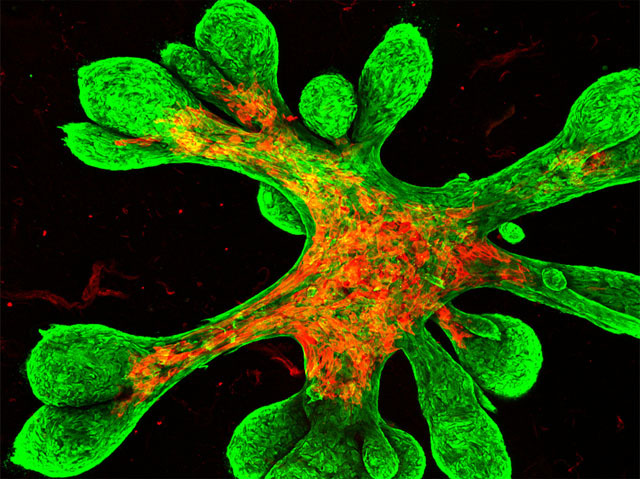 Cells sprawl out in three dimensions in our bodies – making contact with other cells, binding themselves to bones, creating tiny environments of their own. Researchers are now able to recreate some of these nurturing conditions in the lab so they can watch development in action. Eleven days before this picture was taken, breast cells were spread onto a tiny scaffold made of jelly-like hydrogel. The cells gradually stretched out in 3D, much as they would in the developing breast, organising themselves into a network of lobules (seen at the end of each green-coloured duct). After two weeks, the tissue resembles a mature mammary gland, lined on the inside by luminal cells (red). Not only is this fascinating to watch, but the artificial breast tissue responds to hormones similar to those circulating in human mammary glands, meaning they could be ideal for future studies into breast cancer development.