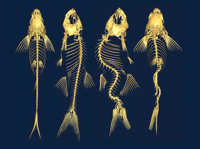 Causing painful curves in the spine, adolescent idiopathic scoliosis (AIS) affects around three percent of teenagers worldwide, and in severe cases may continue into adulthood. The exact causes of this handicapping condition are still unclear, but a zebrafish model is beginning to yield answers. Zebrafish with mutation in the ptk7 gene display the same twisted spines typical of AIS, as seen in the skeletal reconstructions on the right, from the side and back, compared to those of the healthy specimen on the left. Scientists traced the origin of the defects in these fish to malfunctioning cilia, tiny hair-like structures whose beating movements enable the flow of cerebrospinal fluid (CSF) during development. Even after the onset of scoliosis, restoring cilia function and fluid flow in these fish halted the progress of spinal deformity, raising hopes that therapies based on the same principle could be developed to alleviate symptoms in humans too.