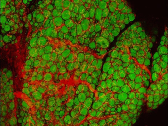 It was previously thought that brown fat (fat cells packed with energy-producing mitochondria) was only present in babies; but in 2009, researchers found small amounts in adults. Compared to white fat, which stores calories, the brown version works to burn calories and generate heat. Having too much white fat (stained green here, with blood vessels shown in red) in areas such as around the hips, belly and thighs, can result in obesity and further complications like diabetes and cardiovascular diseases. New research has uncovered a molecular pathway that activates white fat cells to become more like brown. A protein called FLCN usually works to stop this pathway progressing; however, when FLCN was deleted in a mouse model, white fat cells became more like brown fat cells. Targeting FLCN and other proteins in this pathway could materialise into an obesity treatment.