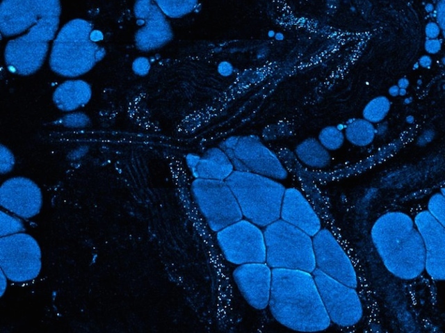 A growing tumour triggers a suite of changes, both within individual cells and on a broader scale, such as an enhanced network of blood vessels. New imaging techniques mean researchers can track these events, studying their connections and importance to the tumour’s growth. For example, probing cancerous tissue with specific wavelengths of light enabled scientists to observe a developing tumour, without genetic manipulation or fluorescent dyes. The first crucial change they noticed was an increased production of vesicles (pictured as tiny blue dots), microscopic spheres of cytoplasm that act as messengers between cells. Vesicles may carry signals that direct subsequent changes in cancerous tissue, or facilitate the spread of malignant cells. Their discovery also has implications for diagnosis: seeing more vesicles could serve as an early warning of cancer, while identifying the provenance of vesicles in blood samples from patients could help determine where cancers are spreading from.