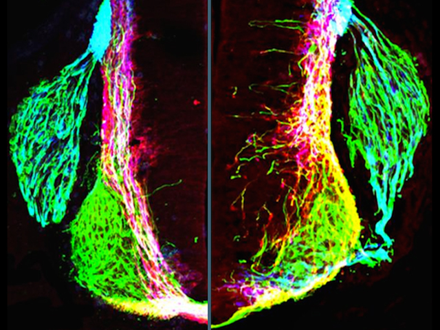 Our nervous system is made up of the brain, spinal cord and neurons [nerves] – an intricate network that allows our brain to communicate with the rest of our body. Development of the human nervous system begins when an embryo is in its 5th week. Neurons extend a projection from their cell body called the axon (pictured in green, pink and blue in a developing mouse spinal cord) along a specific path in response to a variety of molecular cues, systematically guiding its journey to the spinal cord (left) and eventually the wider body, establishing the nervous system. One particular molecular cue called netrin1 organises axon growth, but researchers have been trying to understand how. By halting the activity of netrin1, axon growth was disrupted and highly disorganised (right), highlighting how netrin1 influences axon growth and providing insight into how researchers could regenerate axons in people with nerve damage.