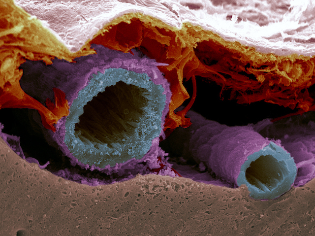 These bright blue tubes are the brain’s drainage system: blood-carrying arteries known as subarachnoid vessels, lying on the spongy brown surface of the brain. Captured with a powerful super-resolution scanning electron microscope and coloured using computer software, the vital vessels are not only responsible for supplying oxygen and nutrients to hungry brain cells, but also taking away toxic waste products. Although these particular vessels are perfectly healthy, researchers are interested in finding out what happens when they don’t work properly. Unless they’re regularly washed away, harmful molecules can build up in the arteries and smaller blood vessels and cause a condition known as cerebral amyloid angiopathy (CAA) – a key feature of the incurable neurodegenerative disease vascular dementia. By zooming in on the brain’s drains, researchers are hoping to find out how they may be involved in the development of dementia, which could lead to new ideas for treatment or prevention.