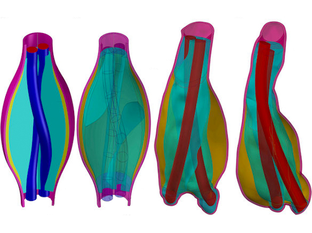 Aneurysms are balloon-like bulges in the sides of blood vessels, where the delicate lining spills out through weak points in the vessel wall. A burst or rupture can cause fatal internal bleeding in the brain, or in this abdominal aortic aneurysm. To treat aneurysms, surgeons commonly insert a stent – a sort of pop-up cage, which supports the weakened vessel from within. In this mathematical model, a new approach is tested – filling the vessel (purple) with a polymer (coloured light blue in the 'healthy' vessel on the left) keeping stents (dark blue) in place as blood is carried down from the kidneys above to the iliac arteries in the groin. The model makes a disturbing prediction that day-to-day forces in a human body, like the pendulum swing of the legs, could disrupt the 'seal' of the polymer (right images). Examining this virtually may prevent future risks to aneurysm sufferers.