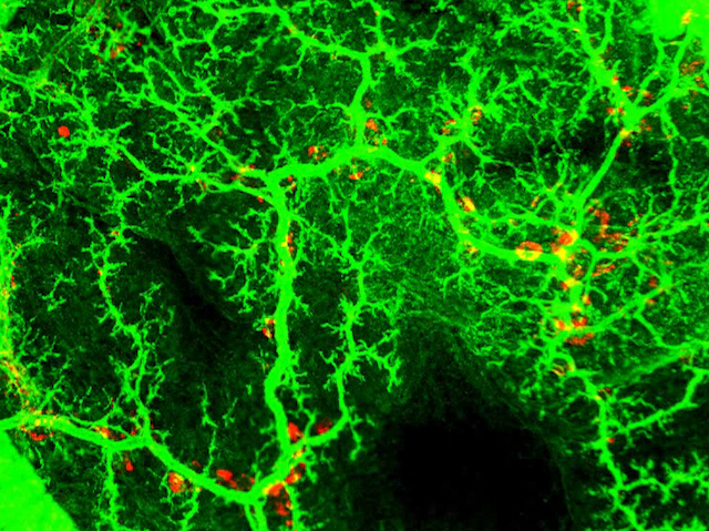 Nestled between the liver, spleen and small intestine, the pancreas supports our nutrition with two key functions: secreting the hormones insulin and glucagon into the bloodstream to regulate blood sugar levels, and producing digestive enzymes. A complex branching system of ducts transports these enzymes into the duodenum, the first segment of the small intestine, where they break down food particles coming from the stomach. In the embryonic mouse pancreas pictured, red staining marks out the insulin-producing islets of Langerhans, while the pancreatic ducts and thicker duodenum, around the outside, are shown in green. Developing this network of pancreatic ducts requires several stages: first, clusters of cells organise to make small tubes, eventually creating a dense web of ducts, which is then pruned to become a more streamlined system, maintaining only the most useful ducts. Investigating this process could help us understand the development of other secretory glands in the body.
