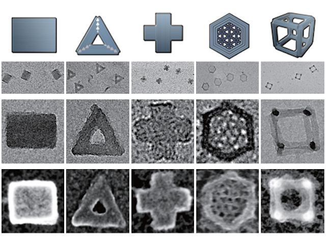 In oceans, lakes and rivers all over the world, microorganisms called diatoms are sculpting strangely shaped shells – pyramids, stars, bowl-like curves, all built slowly from layer upon layer of silica. Inspired by these creative microbes, nanotechnologists are creating their own sturdy silica designs (shown on the top row) with thousands of uses. First they use DNA origami to produce a sort of scaffolding out of a mesh of DNA strands. Next, clumps of silica are pulled towards the DNA by their electrical charge. Layered up like an artificial diatom shell, the finished biomimetic structures (pictured here with two different types of high-powered microscope) are much stronger than DNA scaffolding alone. They could be just the thing to deliver drugs inside the human body, all while withstanding the sloshing currents in our veins and tissues – much like the diatoms bobbing in the ocean waves.