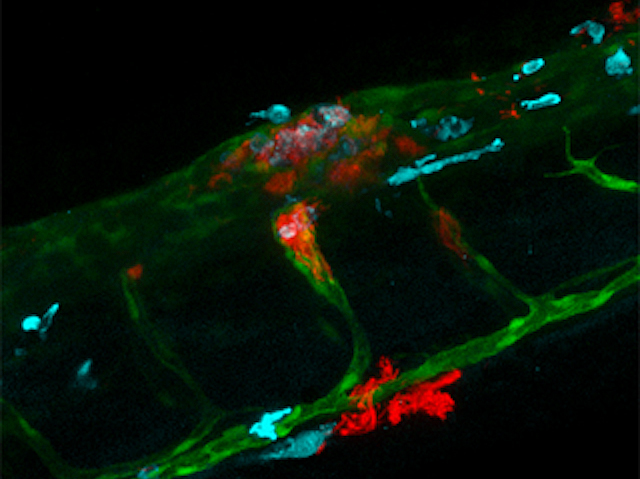 Responsible for causing tuberculosis, a disease affecting millions of people worldwide, Mycobacterium tuberculosis can infect macrophages, immune cells which normally engulf and destroy pathogens. Critical to the bacterium’s success is a sophisticated secretion system, enabling it to transport useful compounds into host cells. Multiple proteins make up this system but their specific roles are difficult to disentangle, so researchers are investigating them in a closely-related pathogen, Mycobacterium marinum, causing tuberculosis in fish. They found especially intriguing results for one protein, named EspH. While bacteria lacking EspH were less effective at infecting macrophages in the lab, they were very virulent when infecting zebrafish larvae, forming aggregates inside and around zebrafish blood vessels, a phenomenon known as cording (pictured, with bacteria in red, blood vessels in green and macrophages in blue).This suggests that host factors interact with the bacterium’s own proteins, adding another layer of complexity to the processes behind tuberculosis infections.