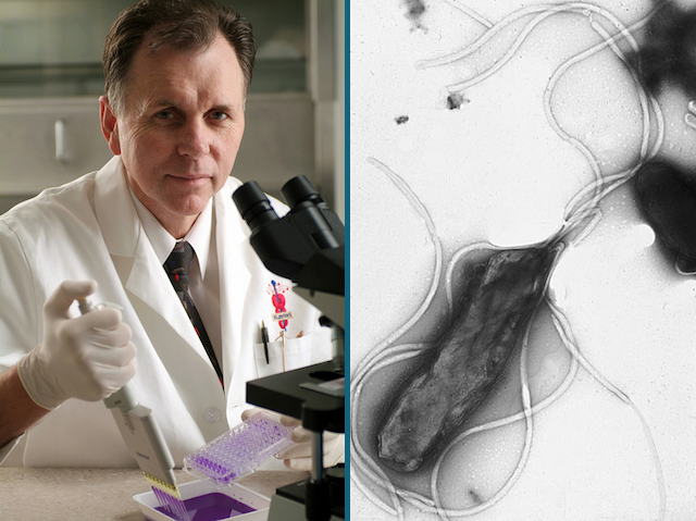 Lurking inside each of your organs is a whole world of life. Millions of bacteria mill around, helping, harming, or simply observing our body’s many processes. It’s easy to misattribute any influence these hidden passengers might have on other things. For example, for decades we thought peptic ulcers and stomach inflammation were largely caused by stress and lifestyle. But when a researcher in the early 1980s noticed groups of an unfamiliar bacteria in samples from patients’ stomachs, it opened the door to other possibilities. Barry Marshall, pictured and born on this day in 1951, delved deeper and discovered Helicobacter pylori (right), a bacterium that turned out to be very prevalent and the actual cause of peptic ulcers. With that revelation, which won Marshall a share of a 2015 Nobel Prize, these chronic and debilitating illnesses at once became treatable, and the crucial link between infection, inflammation, and ultimately cancer became clear.