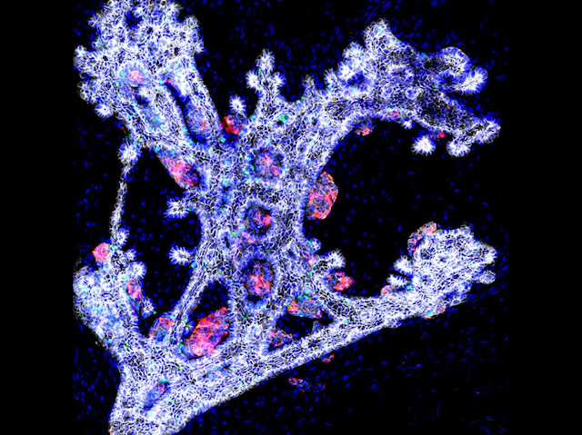 Responsible for producing both pancreatic juices for digestion and hormones regulating blood glucose levels, the pancreas develops from buds of the foregut into a complex multifunctional structure. Pancreatic progenitor cells become either the pancreatic ducts, transporting the pancreatic juices, or the hormone-producing endocrine system, including beta cells synthesising insulin. Guiding cells to either of these fates requires molecules from the Notch signalling pathway, along with a protein called YAP1. In this pancreatic bud, blocking YAP1 leads to more endocrine cells developing, so producing more hormones (in red). Yet pancreatic development is still more complicated, as YAP1 and Notch activity depends on contacts between the pancreatic cells and different proteins in the surrounding extracellular matrix. For researchers working on type I diabetes, an auto-immune disease targeting beta cells, understanding pancreatic development is especially relevant, ultimately helping to better generate endocrine cells in the laboratory, for future replacement therapies.