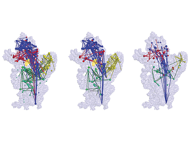 All cells, whether animal, plant, fungal or bacterial, are packed with proteins. There are proteins that build cellular structures, carry out the chemicals reactions that produce energy, or send and receive signals, as well as everything else required for life. But all these proteins have to be made in the first place. That’s the job of ribosomes – molecular ‘factories’ constructed from proteins and RNA [a chemical that’s very similar to DNA]. Researchers have been using detailed analytical techniques to investigate how ribosomes inside living bacteria change shape as they build proteins, and how an antibiotic called spectinomycin sticks to them and shuts down production. The grey blobs in this image show the structure of a bacterial ribosome, while the coloured circles and lines highlight the places that are affected by spectinomycin, shedding light on how bacteria can evolve antibiotic resistance by altering specific parts of their ribosomal proteins or RNA.