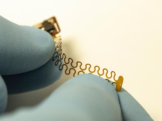 Monitoring oxygen levels in animal and human tissues is of relevance to the study of a wide range of diseases and conditions, including cancer, peripheral artery disease, stroke and more. But existing oximeters have their limitations. Animals may need to be tethered to the device, or anaesthetised, for example, and there is generally speaking a limit to the depth of tissue that can be assessed. The tiny device pictured, however, is a fully implantable, wireless oximeter that can be used in untethered live animals. It consists of a thin filamentous probe containing microscale LEDs and a photodetector – for assessing the different optical properties of oxygenated and deoxygenated blood – and an electronic unit for wireless charging and communication. Remarkably, the device has been shown to work when implanted into the brain of a freely moving mouse – a feat that would have been practically impossible with existing technologies.