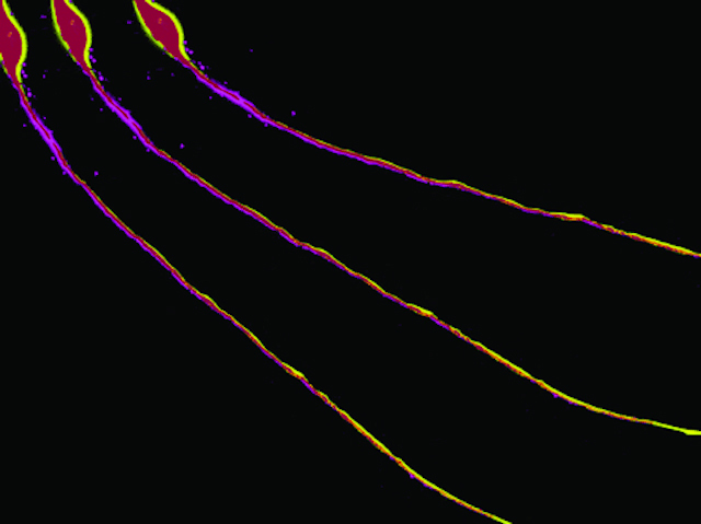 Your brain and spinal cord are connected to the rest of your body through a delicate network of nerves. Injury to these nerves causing loss of communication with the brain can result in severe and life-long disabilities. Scientists are keen to learn more about how some species, like the tiny roundworm C. elegans, spontaneously repair damaged nerve fibres through a process called axonal fusion. Now researchers have identified a specific protein, called GTPase RAB-5, which prevents nerve fibre fragments from fusing back together. When this protein was blocked, the fusion process was restored. This image shows one such repaired roundworm neuron (repeated) with different proteins fluorescently coloured. In future, this new knowledge could be applied to encourage nerve fibres to heal and even bring about long-term recovery for patients with peripheral and central nerve injuries.