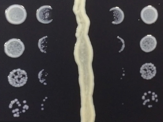 In bacterial communities, competition for resources can be fierce. Legionella pneumophila, the bacterium responsible for Legionnaire’s disease, a severe condition resembling pneumonia, shares contaminated plumbing systems with many potential rivals. While it produces no antibiotics or toxins to fight them off, it can still inhibit the growth of other Legionella species, using a molecule named HGA. On the plate shown here, HGA secreted from the line of L. pneumophila in the centre prevents the growth of other Legionella nearby. L. pneumophila is also sensitive to HGA, but a sophisticated mechanism protects it from self-harming: the bacteria become resistant to HGA when their population density is high, and only secrete it under those conditions, allowing them to safely eliminate competitors as needed. For its human hosts, removing Legionella from water supplies is an enduring challenge, but understanding how these bacteria interact with others could suggest new ways of tackling the problem.