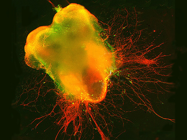 Spots, sweating and growing pains – puberty can feel awkward but it’s all part of normal development. However, for those with congenital hypogonadotropic hypogonadism (CHH), puberty never happens. Multiple genetic mutations cause CHH though only some have been identified. They lead to a deficiency in the hormone GnRH, with defective migration of neurons during brain development, and often an inability to smell. Researchers found novel mutations in a proportion of CHH patients which prevent the hormone AMH and its receptor AMHR2 from working. Here, AMH-containing GnRH neurons from a normal mouse are seen venturing outwards from developing nasal tissue (pictured, green), a process which occurs during normal development as these neurons journey to the brain to form connections essential in triggering puberty. Mice engineered to lack AMHR2 had defective neuron development within nasal tissue and defective GnRH neuron migration to the brain. Disrupted AMH signalling therefore contributes to CHH development.