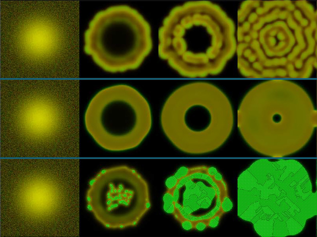 Using maths to study microbes might sound strange but these computer simulations could help to explain how bacteria grow and spread. In any population there’ll be co-operators – individuals that share their resources for the greater good of the group – as well as cheaters, who take more than their fair share. By testing out different scenarios based on how cheats (red) and co-operators (green) interact and move around, researchers can see what kinds of patterns emerge over time. In some cases, the cheats and co-operators end up segregating into separate areas (top), in others they mix (middle) and sometimes the co-operators win (bottom). Figuring out how these populations interact could shed light on how colonies of harmful antibiotic-resistant bacteria emerge and spread. More widely, the same equations apply to all kinds of species from bacteria all the way up to birds and animals, and perhaps our own human communities too.