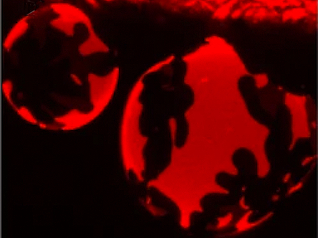 The lipid membranes wrapping our cells swirl with chemical currents, a bit like the rainbow spirals we see on the surface of soap bubbles catching the light. The same is true for vesicles, tiny membrane pockets (10,000 times smaller than a soap bubble) which shuttle precious cargoes around inside and between our cells. The molecular makeup of a vesicle’s membrane affects its structure, flexibility, even how it reacts on contact with cells. Pictured under a high-powered microscope, these lab-created vesicles contain sphingolipids creating rigid membrane regions, seen as separate dark ‘domains’ in the swirly fluid surface, artificially stained red. Investigating different mixtures of sphingolipids may help to build vesicles to transport and release drugs inside the body, or, as suggested by another recent study, to concoct combinations which are toxic to cancer cells.