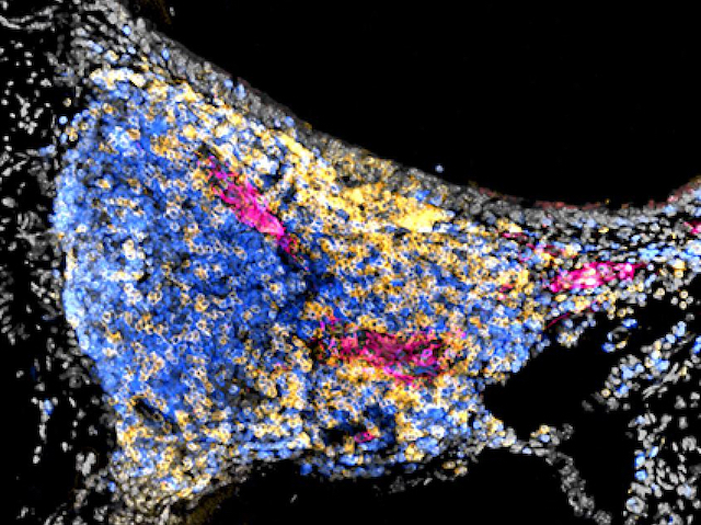 As you take a deep, calming breath in through your nose, countless potentially threatening foreign particles are filtered from the air before it rushes into your lungs. Our immune system constantly watches for unwanted invaders like viruses and bacteria, so how does it resist the temptation to leap into action against every one of these harmless fragments? A new study found that the protective immune cells resident in the mucus that lines our nasal passages (pictured with immune B (blue) and T (yellow) cells highlighted) are kept calm by the soothing presence of another member of the immune system: dendritic cells. However when action really is needed, different dendritic cells arrive and rally the troops. The researchers then trialled a new form of vaccine that encouraged this recruitment process, boosting the immune response and hence improving efficacy, when the global need for vaccines has never been greater.