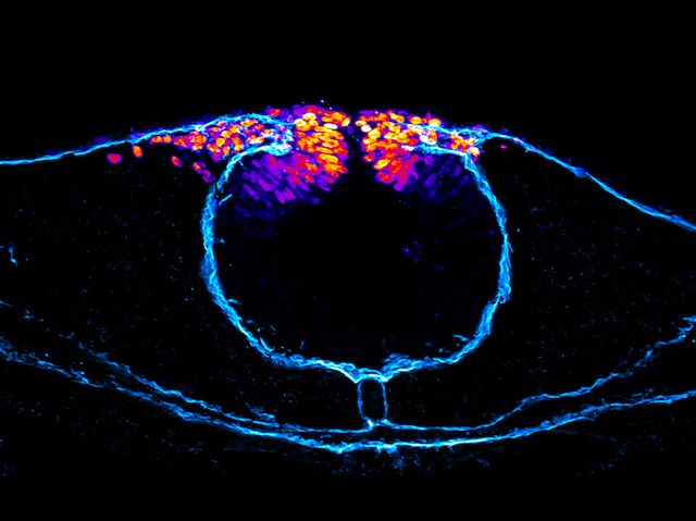 Many parts of your body – including most of your face, pigment cells and some types of muscles and nerves – start out from a tiny cluster of cells that are laid down during one of the earliest stages of development. Known as the neural crest, these cells migrate all over the developing embryo, eventually settling down and specialising into the appropriate parts. This image shows neural crest cells (orange) in a developing chicken embryo, just after they have started to migrate. Using this system, researchers have discovered that a gene called Hmga1 is involved in telling cells first to become neural crest and then go on the move. Problems with neural crest cells can lead to birth defects and diseases such as skin cancer (melanoma) and childhood nerve tumours (neuroblastoma), so understanding more about the role of Hmga1 could shed light on what causes these conditions and how to treat them.