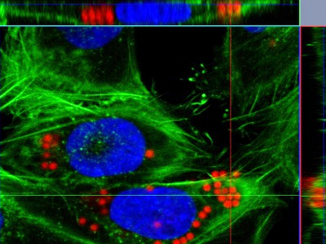 It stands to reason that the better a cancer cell is at squeezing into spaces and crawling about, the better it would be at invading tissues around the body (metastasis). Indeed evidence suggests that the deformability of cancer cells is correlated with their aggressiveness. Until recently, however, there was no convenient measure of this mechanical property that could be translated into a diagnostic indicator – that is, a way to test a patient’s cells to see how aggressive they may be. But, researchers have now discovered that the most invasive, deformable cells also tend to engulf more extracellular particles. The cancer cells pictured, for example, have gobbled up a large number of red fluorescent microbeads. And this behaviour lends itself more readily to detection and quantification. Aside from developing novel diagnostic assays, researchers may be able to exploit this new found gluttonous behaviour to target drugs into the most invasive cells.