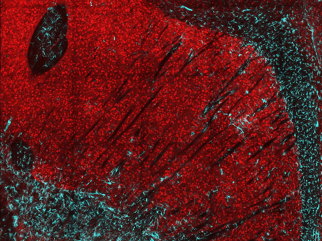 Huntington’s disease is a rare and incurable, neurodegenerative disorder characterised by uncontrolled movements, changes in mood, and declines in reasoning and memory. The causative mutation – which creates an abnormally extended version of the huntingtin protein – was discovered decades ago, yet the protein’s normal function and how its mutation leads to pathology remain unclear. Because huntingtin interacts with many cellular proteins, its abnormal extension was widely considered to be a gain-of-function mutation – one that causes excessive recruitment of interacting proteins resulting in toxicity. But recent work reveals that loss of huntingtin function in mouse brain striatal neurons (red) can cause Huntington’s-like pathology and symptoms too, including impaired neuronal survival, infiltration of other brain cells called glial astrocytes (cyan), and movement and coordination deficits. This new view of Huntington’s pathology suggests that current therapies aimed at suppressing the mutant protein may in fact be counterproductive and that a new drug design perspective might be required.