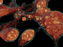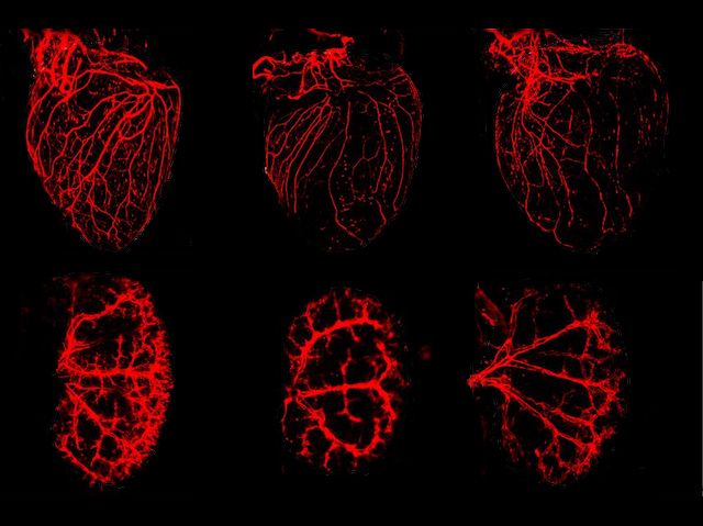 Don’t be fooled by the delicate red traces in these images of developing mouse hearts (top row) and kidneys (bottom). They may look like blood vessels, but they’re actually the long tails of sympathetic neurons. These are a key part of the autonomic nervous system, responsible for controlling the unconscious actions that keep the body alive. As well as helping to maintain healthy functions under normal conditions, sympathetic neurons are involved in triggering the ‘fight or flight’ response that’s brought on by stressful situations – for example, making the heart beat faster or increasing blood pressure by retaining water that passes through the kidneys. The two columns on the right show organs from animals with faults in a gene called Pggt1b, which normally guides the growth of sympathetic neurons and enables them to extend deep into the developing tissue. Without the gene these nerves don’t grow properly, causing problems later on.