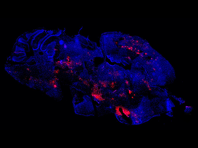 From dengue to Zika, mosquito-borne viruses are a significant global problem, likely to grow in the face of climate change. Many of these viruses co-occur and initially cause similar symptoms, making early diagnosis difficult, but recent research suggests that multiple viruses could be tackled in the same way, by boosting immune defences in the skin. Experiments on both mice and human skin samples suggest that quickly applying a skin cream containing the anti-viral imiquimod, currently used to treat basal cell skin cancer, on mosquito bites can reduce the extent of infection by several viruses. Pictured is a section from a mouse’s brain, infected by the mosquito-borne Semliki Forest virus (in pink); imiquimod application reduced viral replication in the skin and its spread to other tissues, significantly increasing survival. Subject to testing for safe use in this context, imiquimod-containing creams could potentially provide some protection against a range of mosquito-borne viruses.
