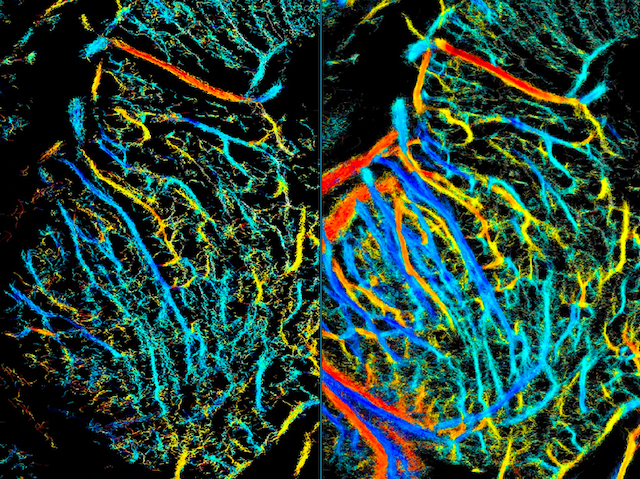 Ultrasound scans are used to image tissues in the body for medical reasons. Microbubbles can improve the resolution of these scans. These tiny bubbles are injected into the bloodstream and vibrate in response to ultrasound waves. Researchers try to improve this technique for imaging microvessels — the smallest of blood vessels. Small amounts of microbubbles are normally injected, as they need to separate out for accurate images. However, in microvessels where blood flows slower, it takes so long for these few microbubbles to arrive that the tissue moves, distorting the image. Add more microbubbles and they overlap in large blood vessels, also distorting the image. Now a new technique to process these images is tested which separates out overlapping microbubbles based on features such as movement speed and flow direction. Images of chicken embryo blood vessels processed with this technique (right) show clearer microvessels and large vessels compared with unprocessed images (left).