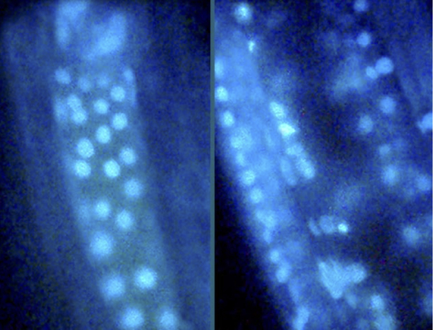 Microscopic parasitic worms infiltrate billions of people’s bodies worldwide and cause everything from blindness to anaemia, and can be fatal. Parasitic nematodes, such as the roundworm species Ascaris suum, have a weakness though: their intestinal cells don’t regenerate, so may not heal when injured. Encouraged by the hope that any interference with the worm intestine might be a killing blow, researchers analysed the genes and molecules associated with its essential functions. They discovered 10 molecules inhibited the organ, seven of which caused severe damage (right, with cell arrangement disrupted after addition of the inhibitor compared to the intestine of an unaltered worm, left). Some of these molecular weapons worked against several different species, suggesting they may be useful for a broad range of infections, and that focusing further research on the intestine – the nematode’s Achilles heel – could lead to new treatments.